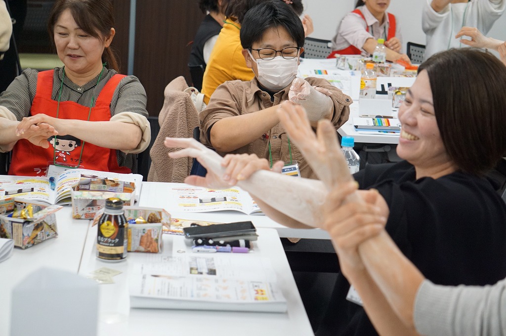 スクワラン子さんの指導のもと、たっぷりとハンドクリームを使用して、ひじの下から指先までほぐす参加者のみなさん。
