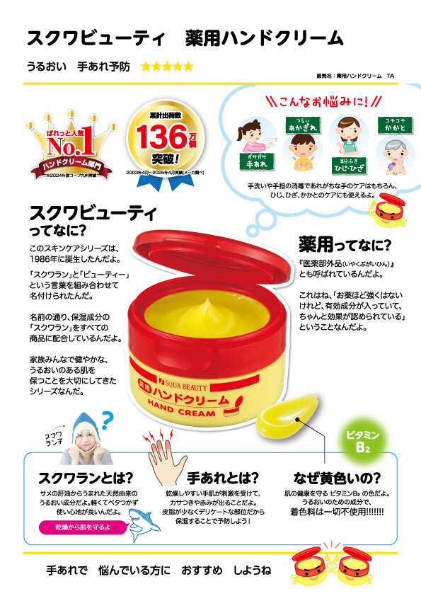 ★スクワビューティ薬用ハンドクリームは、以前使用しておりましたが、今は他の商品を使用しています。今回、ハンドマッサージで、手先のぬくもりと手の大事さを感じました。 また、利用します。これからは、私が感じた事を、伝えていきます。