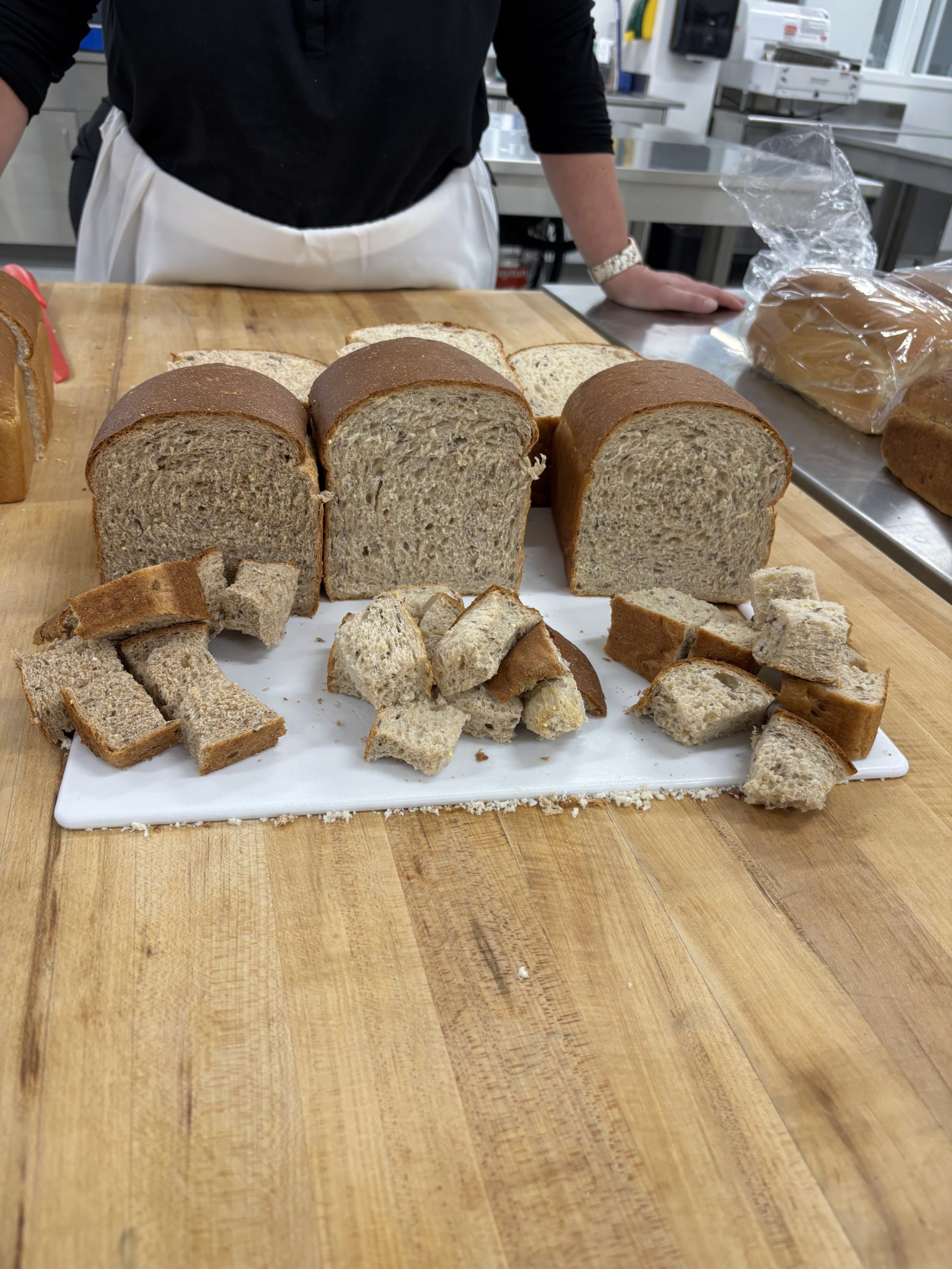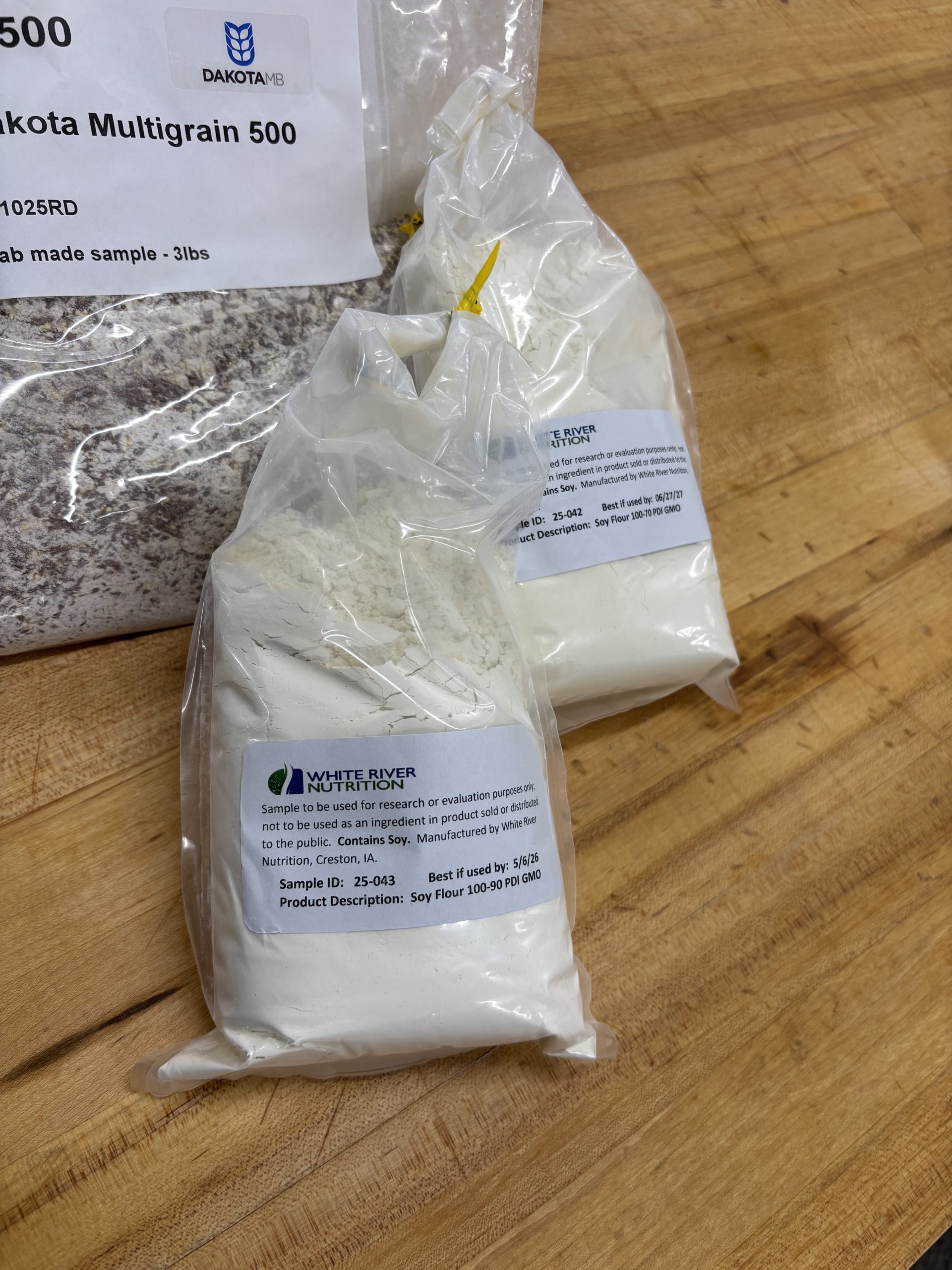ボブさん小麦の製粉を行い、それを使用し、パンを製造しました。3種類のパンを試作し、(ボブさんの小麦を使用したパン、ボブさんの小麦を不使用のパン、ボブさんの小麦と大豆小麦を使用したパン)比較試食を行いました。ボブさんの小麦を使用したパンは吸水力が高く、膨らみが大きくなっていました。また大豆小麦を使用したパンはしっとりとしたもちもち食感のパンとなり、大豆の風味なくおいしくいただきました。