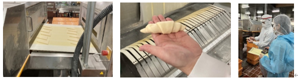 発酵後は、36メートルの長さを持つ4本バーナーの大型オーブンで焼成され、1回で19,000個のクロワッサンを焼き上げることができます。
