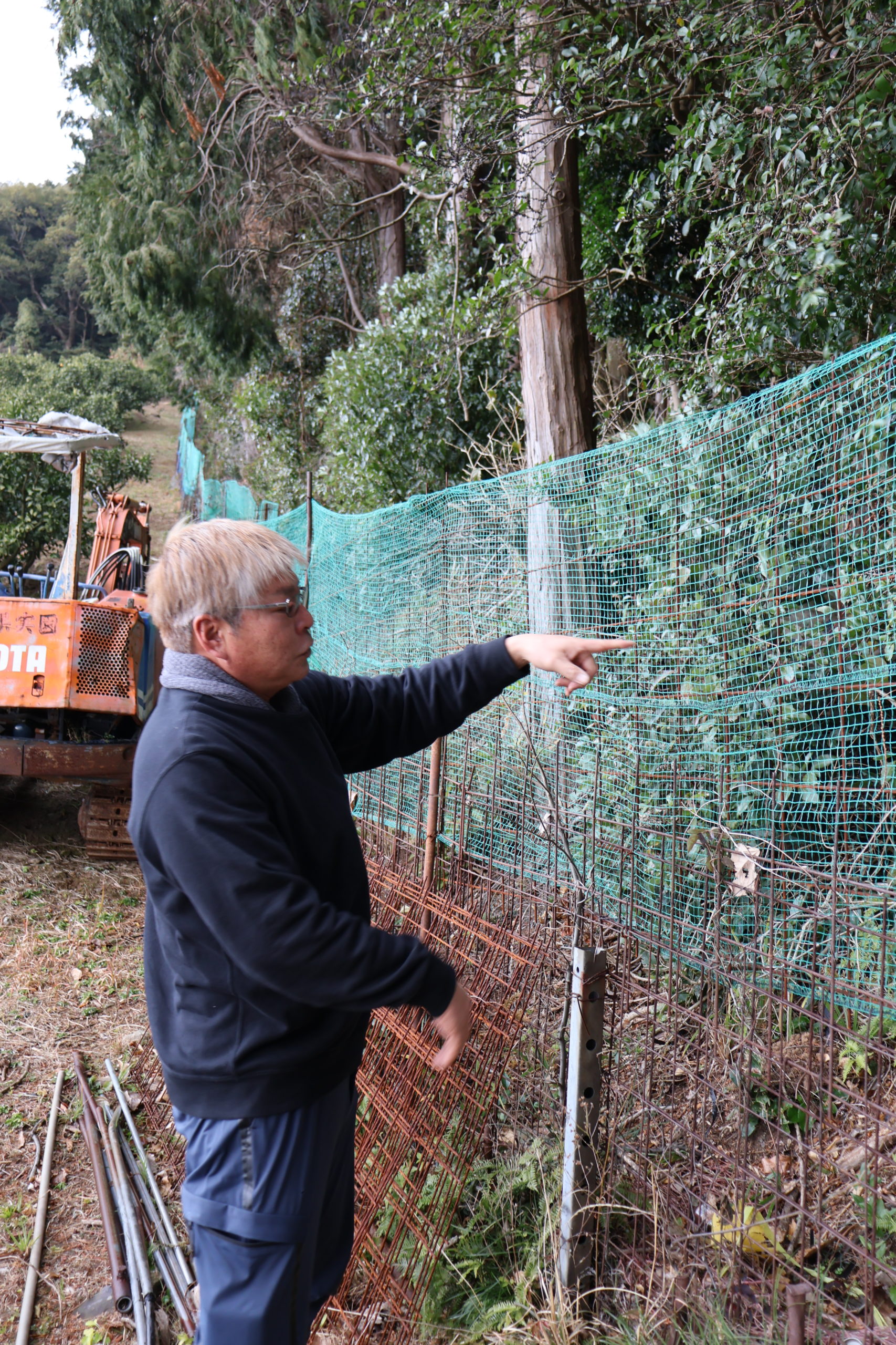 みかん畑を取り囲むように柵が設けられています。この柵、4重になっており、全長は3キロを超すとのこと。すべて張り巡らすのに2年かかったそうです。