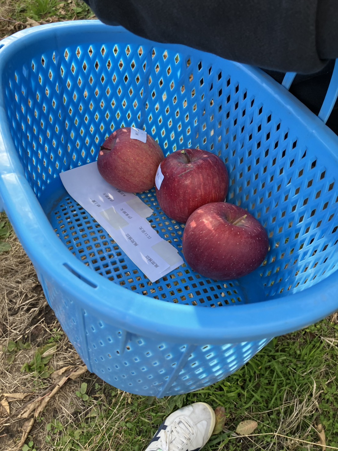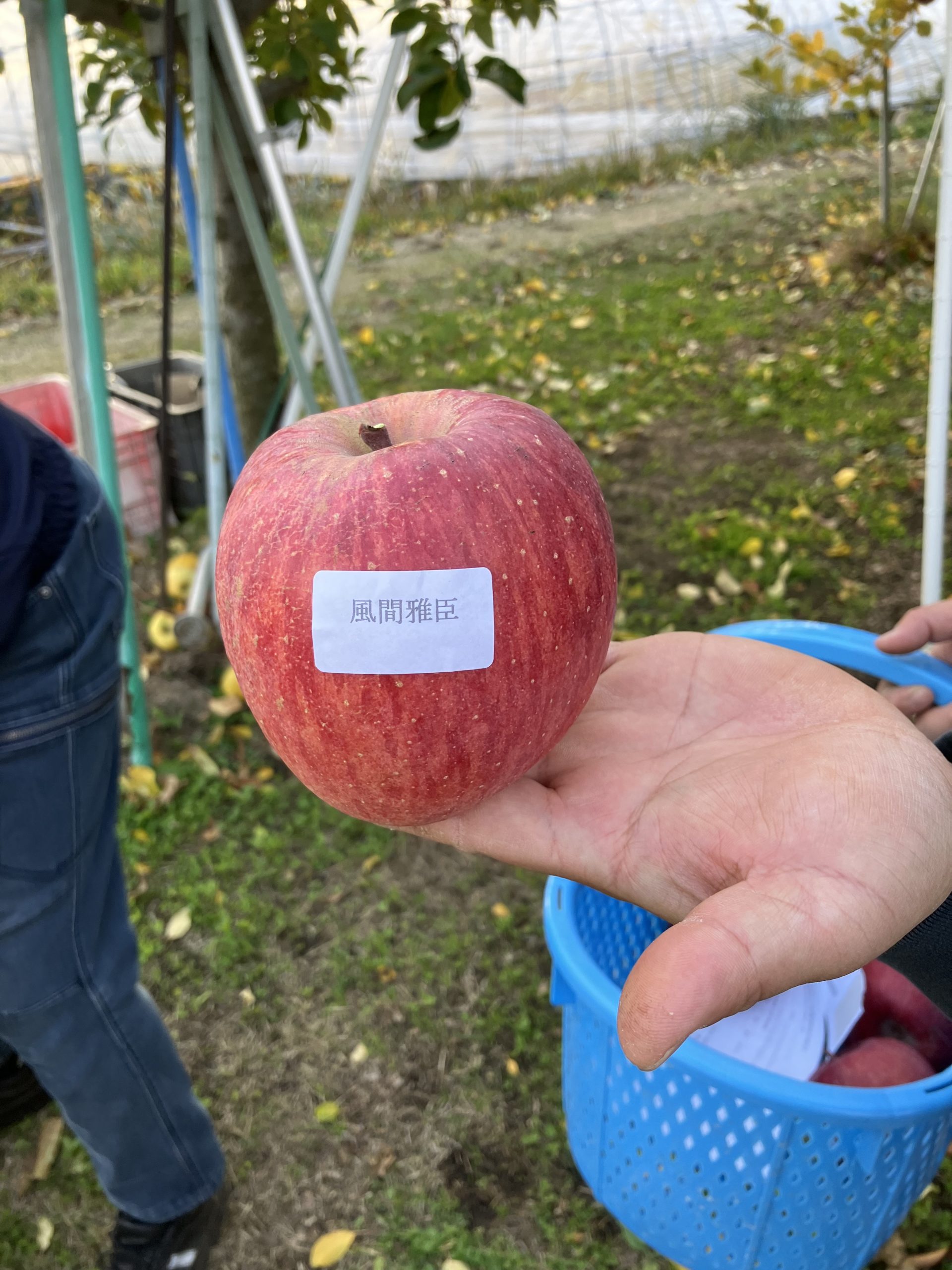 サンプルとして採取した2玉は生産者名の記載されたシールを貼付し、誰のりんごか判別可能としています。この後、全体会議の場に持ち込まれました。