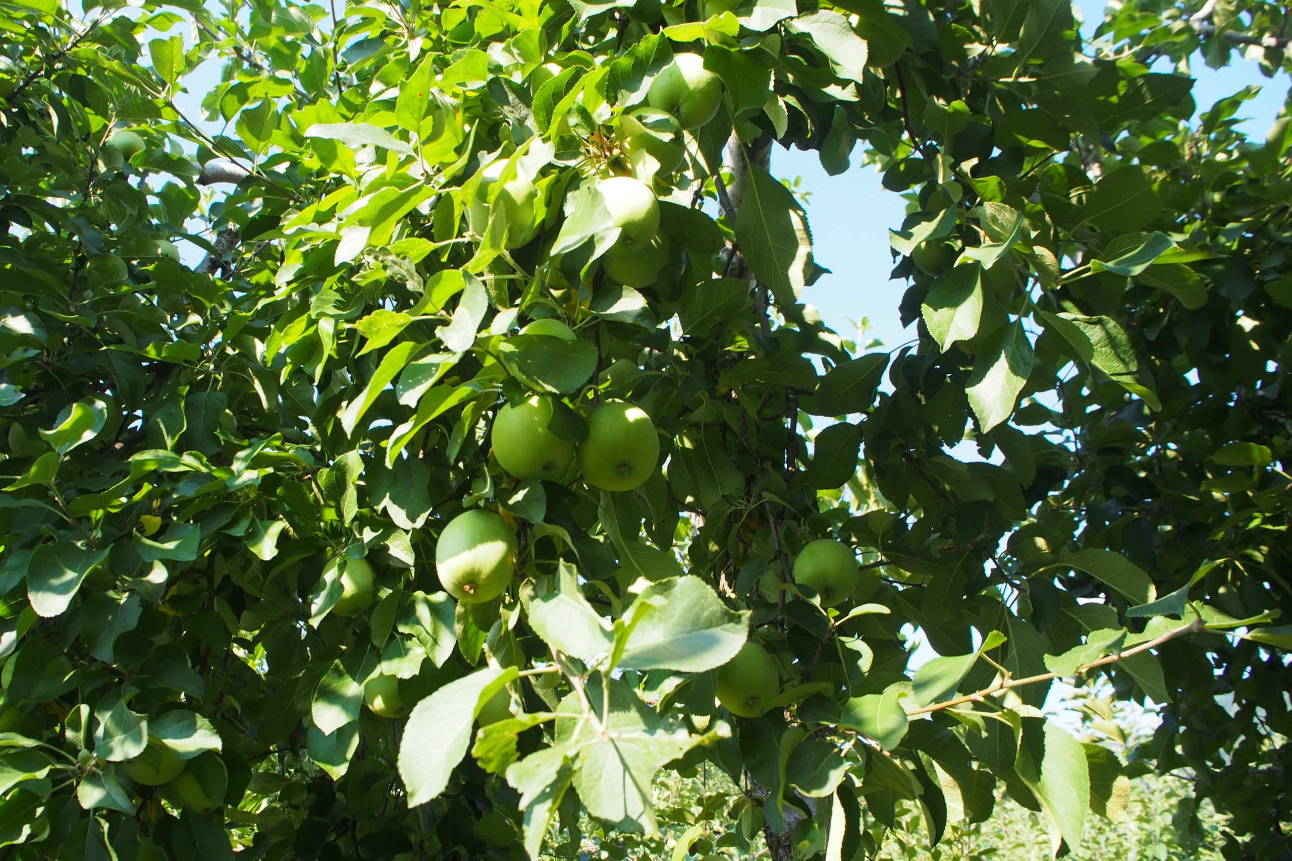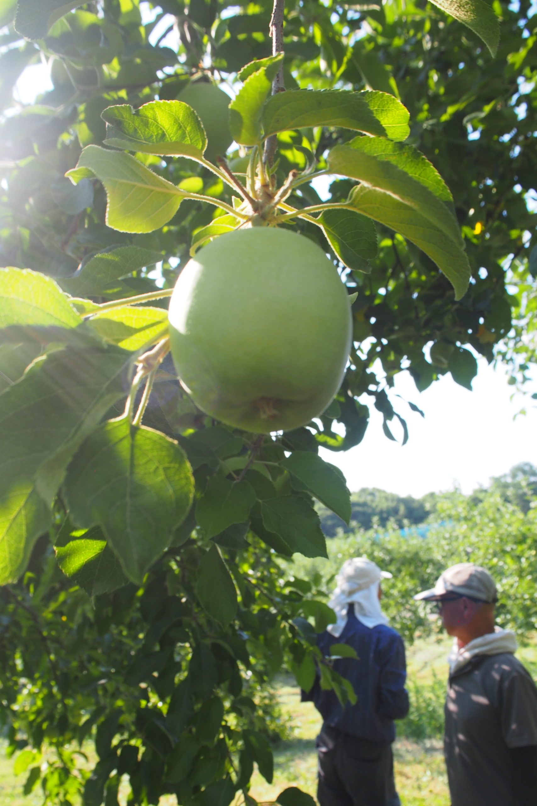 7月の光輝く園地 樹上にある青いまだ色づいていないりんご
