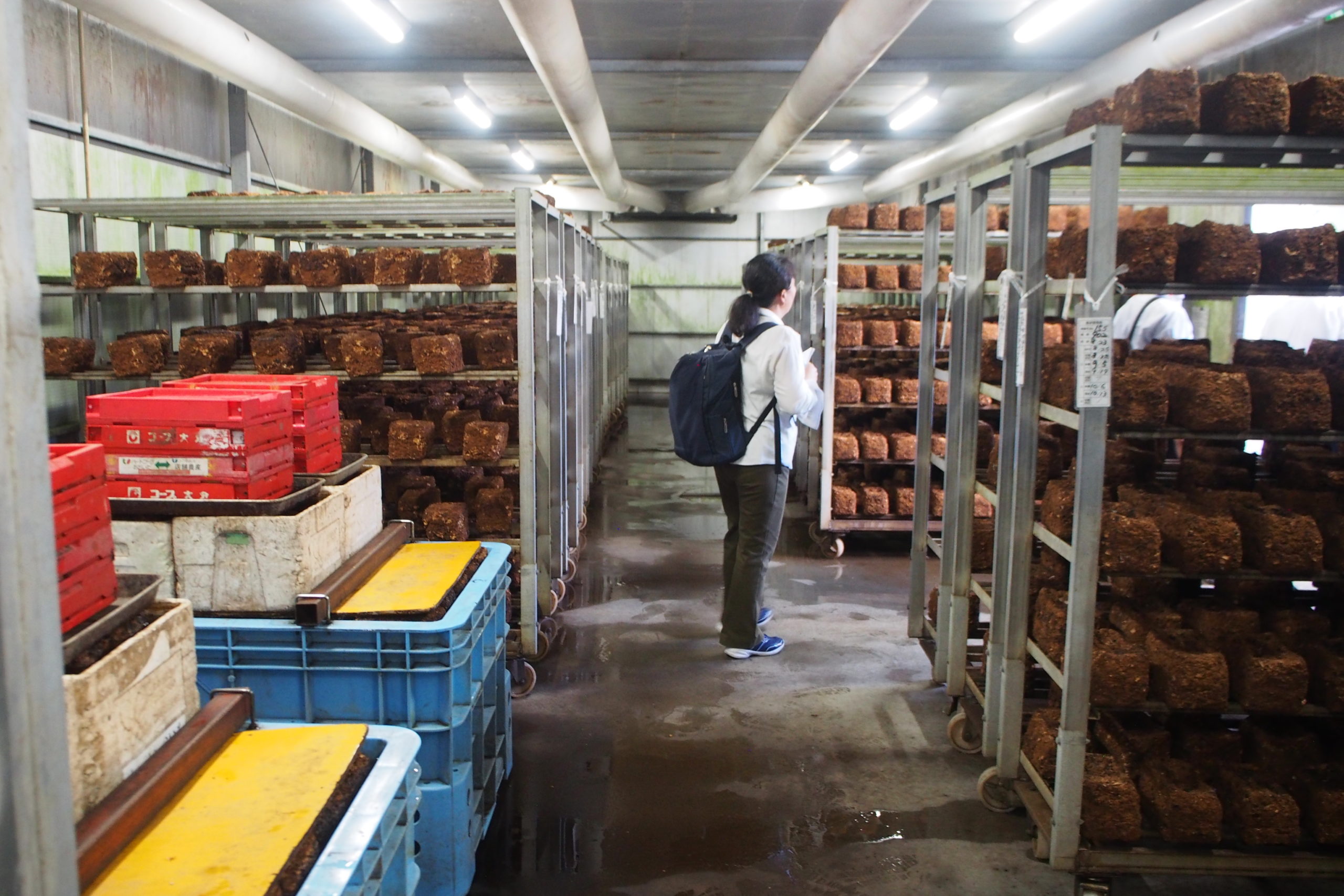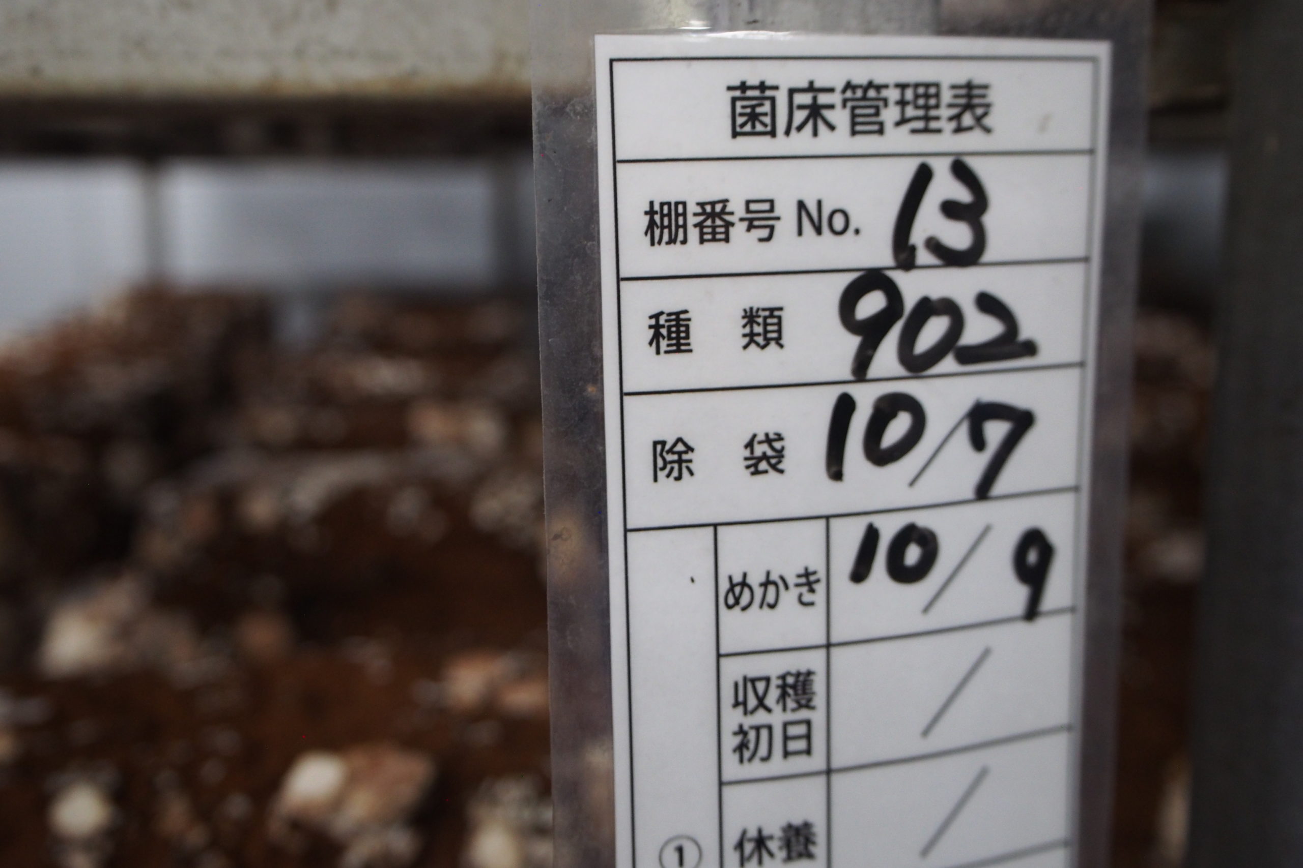菌床を洗ったのち、発生室で保管、1週ほどたつと芽が出始めるため、そこから芽かきダ行が必要に