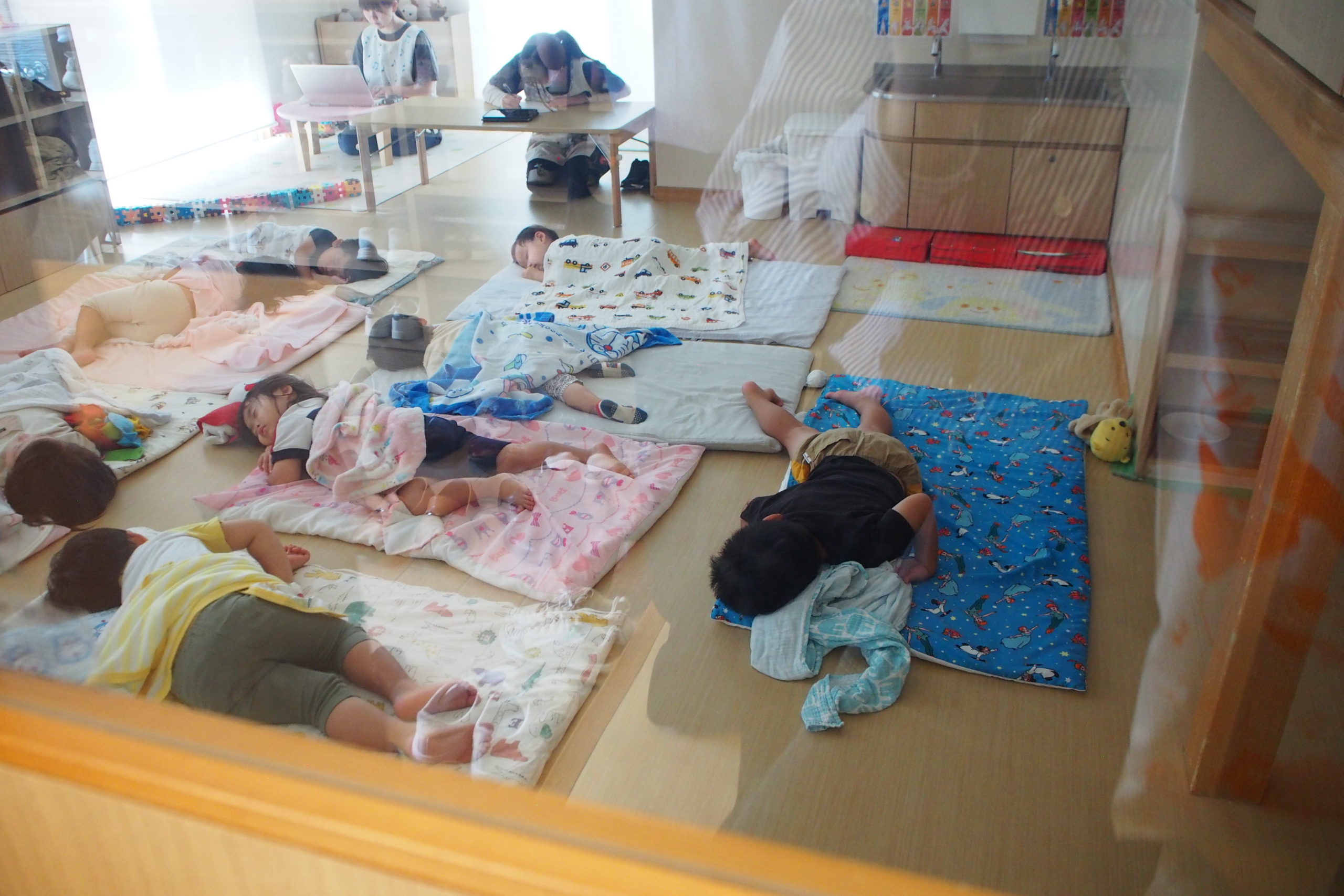 0から1歳児は10分おきに呼吸の点検が必要、先生方はお昼寝中も忙しそうでした。