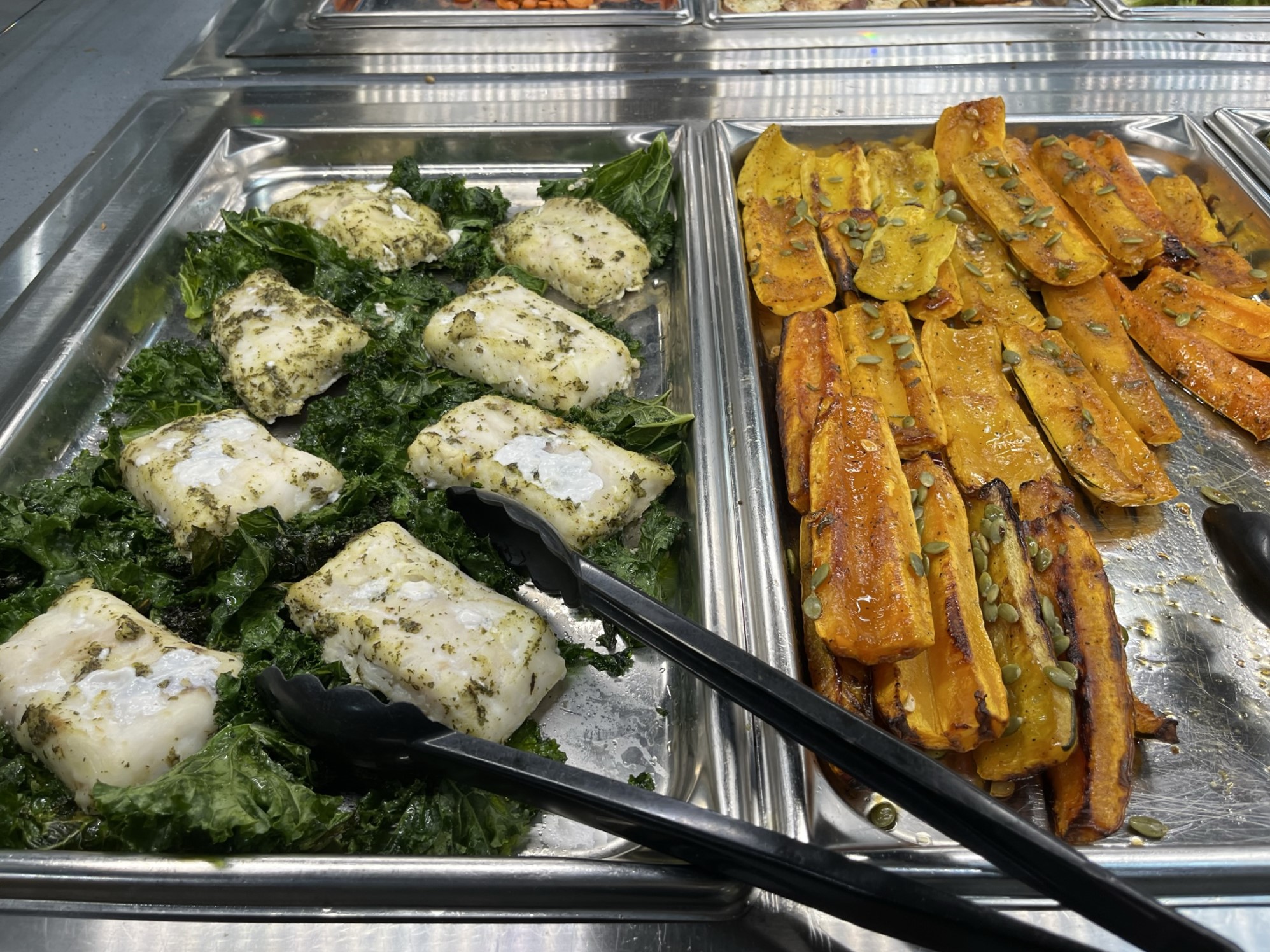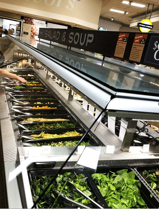 アメリカのスーパーには、量り売りで、自分で好きなものを好きな分だけ選べるサラダバーのようなコーナーがあります。ここで特徴的なのは、日本で一般的な、いろいろな食材を使って料理が完成形になっている「お惣菜」ではなく、野菜・豆類・お肉・お魚などがそれぞれシンプルに調理されて、「単体」で並んでいることなんです。