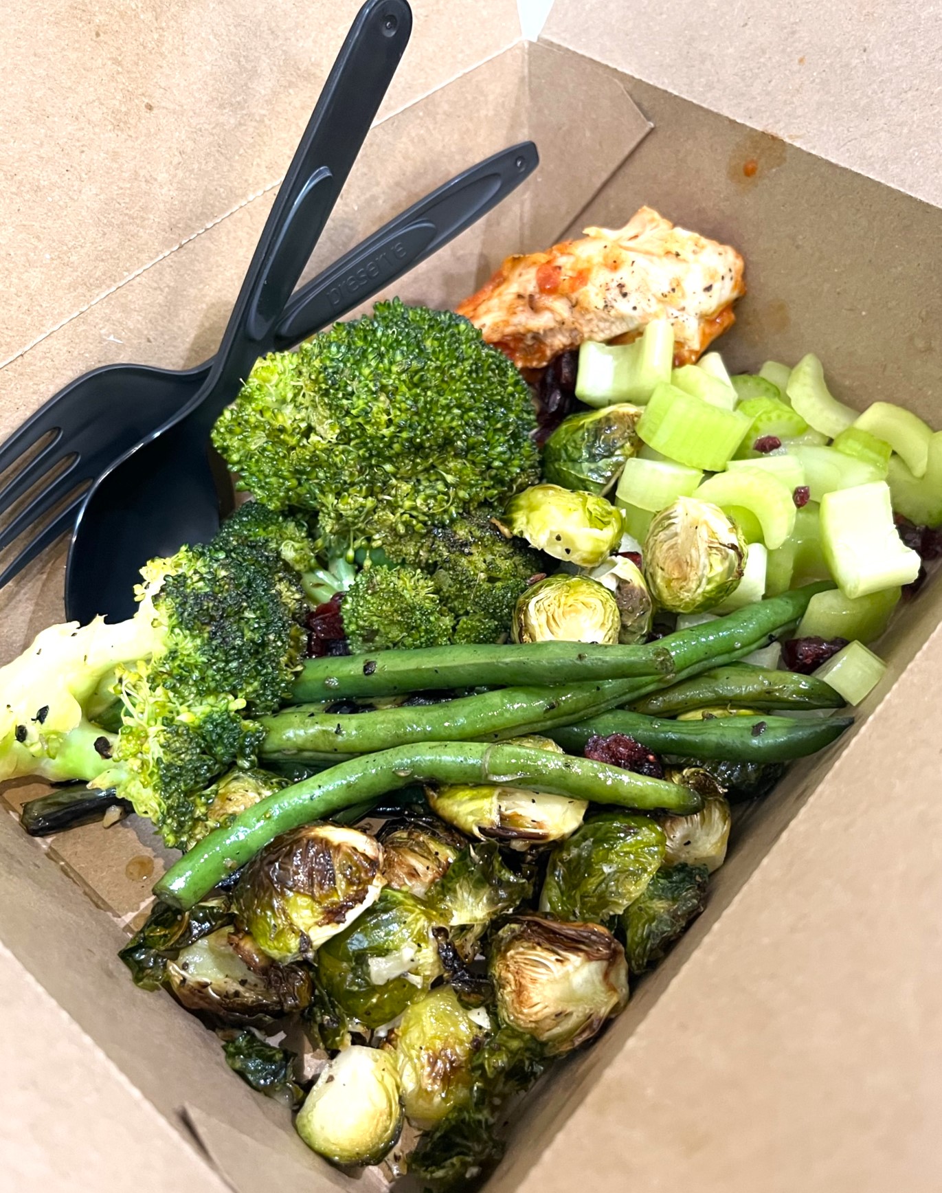 ブロッコリー、セロリ、芽キャベツ、いんげん、鶏むね肉